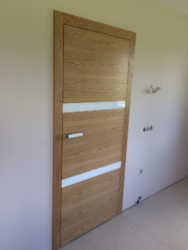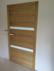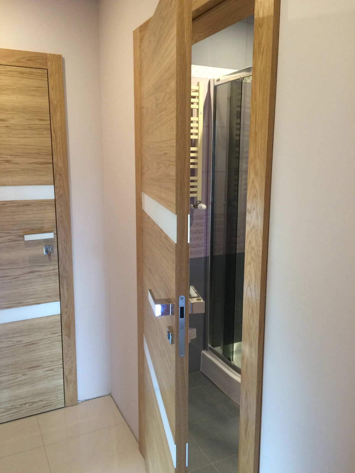 Prezentowane drzwi zostały wykończone w wyselekcjonowanym fornirze Dąb Natura. Standardowo jak wszystkie nasze drzwi i te wyposażyliśmy w niezawodne okucia: zawias chowany niemieckiej firmy Simonswerk Tectus 3d, zamek magnetyczny oraz klamki Tupai. Zastosowany w klamce insert, w kolorze biały połysk, idealnie współgra z wtopionym w skrzydło drzwiowe szkłem. Drzwi stanowią połączenie tradycji z nowoczesnością, dębowy fornir z pięknym słojem nadaje drzwiom niepowtarzalnego uroku i ciepła a chromowe klamki i białe wstawki ze szkła podkreślają nowoczesny charakter całego domu. Szukasz niebanalnych rozwiązań, zapraszamy do naszego salonu w Bielsku Białej, postaramy się stworzyć oryginalne drzwi dla Ciebie !